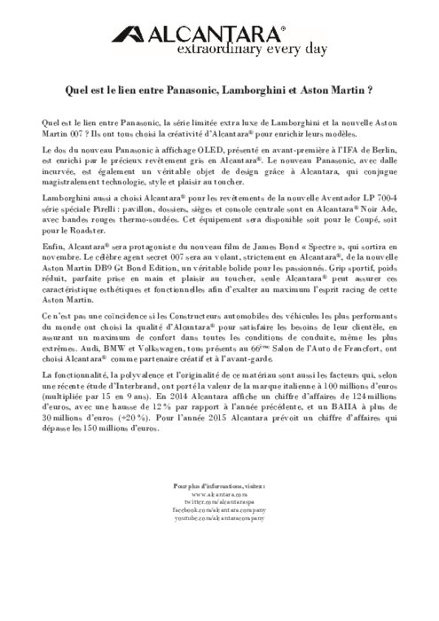 Equipementiers 07 octobre 2015 - 17:51 Quel est le lien entre Panasonic, la série limitée extra luxe de Lamborghini et la nouvelle Aston Martin 007 ? Ils ont tous choisi la créativité d’Alcantara pour enrichir leurs modèles. PDF (51 Ko) Télécharger