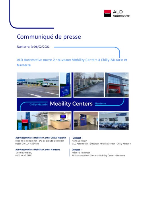 ALD Automotive, filiale du groupe Société Générale et leader mondial des solutions de mobilité (Location Longue et Moyenne Durée / Gestion de Flotte Automobile) poursuit son développement et annonce l’ouverture de 2 « Mobility Centers » à Chilly-Mazarin et Nanterre...