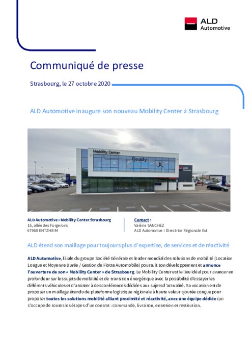 ALD Automotive, filiale du groupe Société Générale et leader mondial des solutions de mobilité (Location Longue et Moyenne Durée / Gestion de Flotte Automobile) poursuit son développement et annonce l’ouverture de son " Mobility Center " de Strasbourg. Le Mobility Center est le lieu idéal pour avancer en profondeur sur les sujets de mobilité et de transition énergétique avec la possibilité d’essayer les différents véhicules et d'assister à des conférences dédiées aux sujets d'actualité...