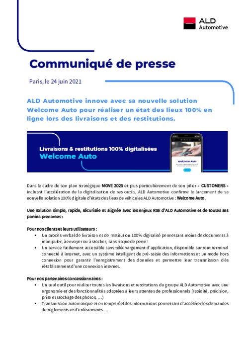 Dans le cadre de son plan stratégique MOVE 2025 et plus particulièrement de son pilier « CUSTOMERS » incluant l’accélération de la digitalisation de ses outils, ALD Automotive confirme le lancement de sa nouvelle solution 100% digitale d’états des lieux de véhicules ALD Automotive : Welcome Auto. Une solution simple, rapide, sécurisée et alignée avec les enjeux RSE d’ALD Automotive et de toutes ses parties-prenantes...