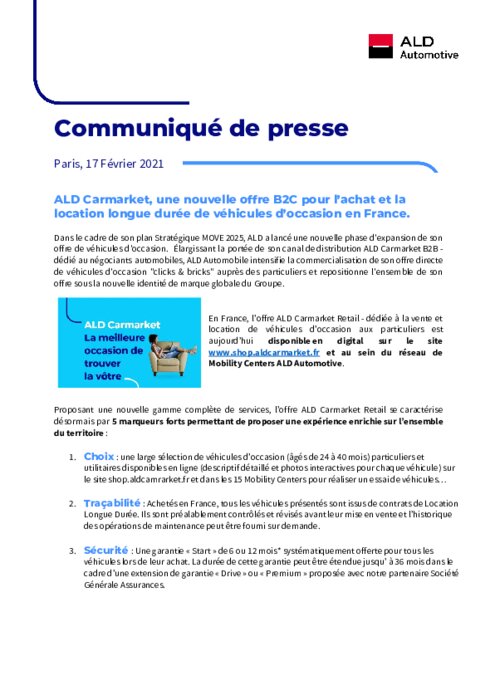 Dans le cadre de son plan Stratégique MOVE 2025, ALD a lancé une nouvelle phase d'expansion de son offre de véhicules d'occasion. Élargissant la portée de son canal de distribution ALD Carmarket B2B - dédié au négociants automobiles, ALD Automobile intensifie la commercialisation de son offre directe de véhicules d'occasion "clicks & bricks" auprès des particuliers et repositionne l'ensemble de son offre sous la nouvelle identité de marque globale du Groupe.