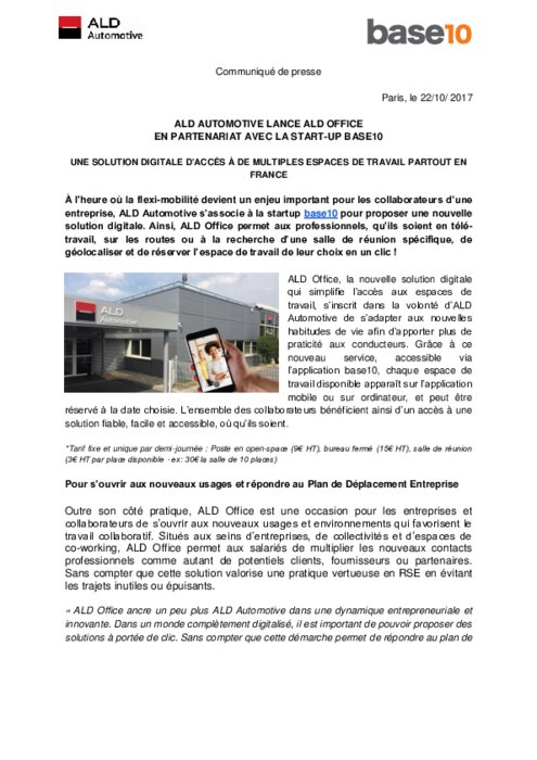 ALD Automotive, leader de la location longue durée et de la gestion de parcs automobiles du Groupe Société Générale, en partenariat avec base10, lance ALD Office, la solution digitale qui permet d'accéder à de multiples espaces de travail partout en France. Cette nouvelle offre s'inscrit dans la volonté d’ALD Automotive de s’adapter aux nouvelles habitudes de vie afin d’apporter plus de praticité aux conducteurs.