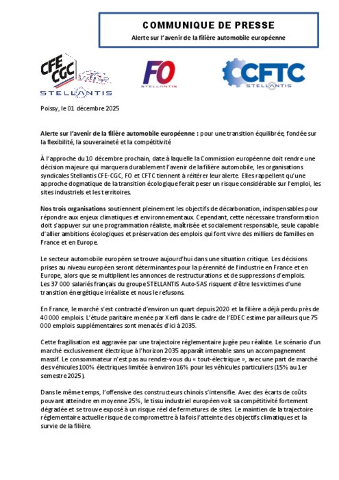 À l’approche du 10 décembre prochain, date à laquelle la Commission européenne doit rendre une décision majeure qui marquera durablement l’avenir de la filière automobile, les organisations syndicales Stellantis CFE‑CGC, FO et CFTC tiennent à réitérer leur alerte. Elles rappellent qu’une approche dogmatique de la transition écologique ferait peser un risque considérable sur l’emploi, les sites industriels et les territoires.