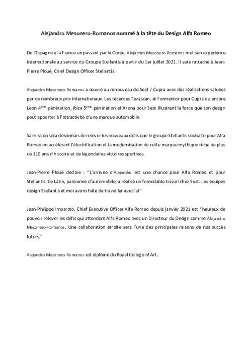 Constructeurs 23 juin 2021 - 17:49 De l'Espagne à la France en passant par la Corée, Alejandro Mesonero-Romanos met son expérience internationale au service du Groupe Stellantis à partir du 1er juillet 2021. Il sera rattaché à Jean-Pierre Ploué, Chief Design Officer Stellantis. PDF (176 Ko) Télécharger