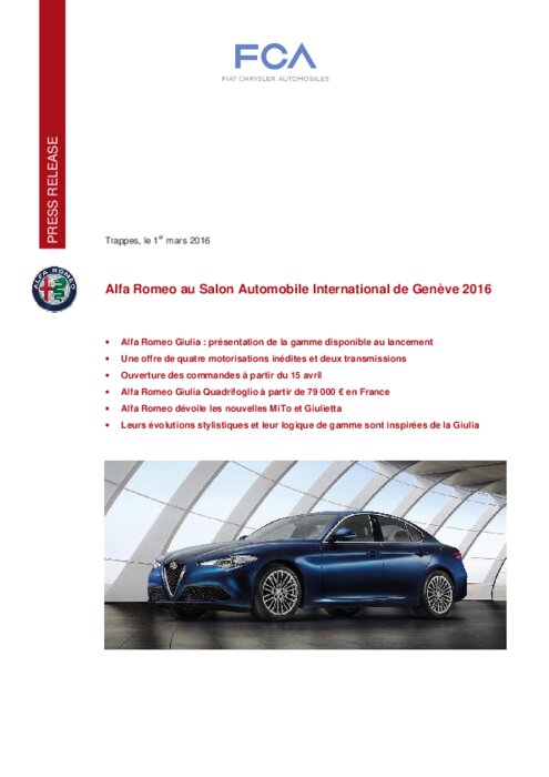 L’un des moments les plus attendus de l’année est arrivé : à partir du 15 avril, la nouvelle Alfa Romeo Giulia sera en effet progressivement disponible à la commande dans la zone EMEA. Quatre exemplaires de cette nouvelle berline seront exposés au Salon de Genève, parfaites représentatrices de la large gamme qui se déclinera au lancement en trois finitions et six ensembles moteurs/transmissions.
