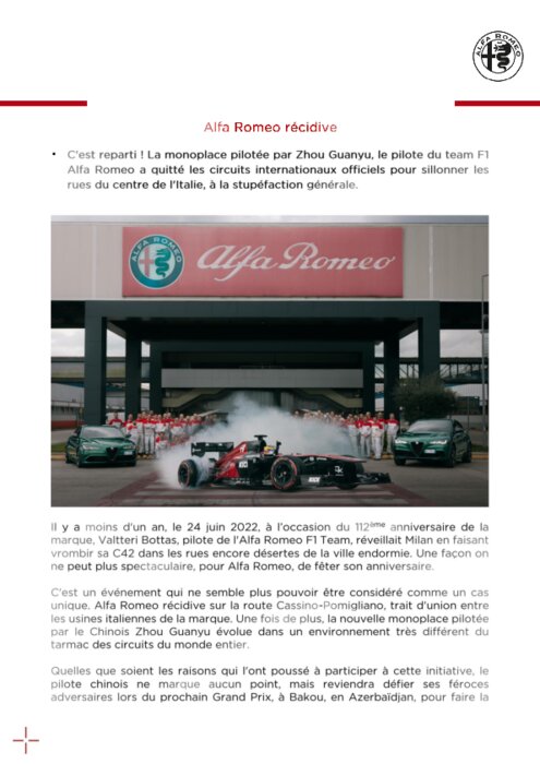 Constructeurs 20 avril 2023 - 17:26 La monoplace pilotée par Zhou Guanyu, le pilote du team F1 Alfa Romeo a quitté les circuits internationaux officiels pour sillonner les rues du centre de l'Italie, à la stupéfaction générale. PDF (417 Ko) Télécharger