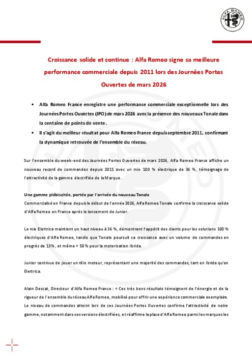 Constructeurs 18 mars 2026 - 16:09 Sur l’ensemble du week‑end des Journées Portes Ouvertes de mars 2026, Alfa Romeo France affiche un nouveau record de commandes depuis 2011 avec un mix 100 % électrique de 36 %, témoignage de l’attractivité de la gamme électrifiée de la Marque. PDF (232 Ko) Télécharger credit Alfa Romeo