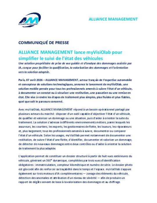 ALLIANCE MANAGEMENT, acteur français de l’expertise automobile et concepteur de solutions technologiques,annonce le lancement de myVisiOlab, une solution mobile pensée pour tous les professionnels amenés à suivre l’état d’un véhicule, à documenter un constat ou à sécuriser une restitution, une passation ou une remise en état. Elle vise à rendre les étapes de traitement plus simples, plus fluides et plus fiables, quel que soit le parcours concerné.
