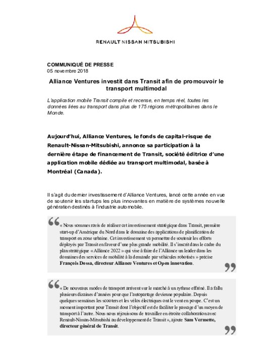 Services 05 novembre 2018 - 15:21 Alliance Ventures, le fonds de capital-risque de Renault-Nissan-Mitsubishi, annonce sa participation à la dernière étape de financement de Transit, société éditrice d’une application mobile dédiée au transport multimodal, basée à Montréal (Canada). PDF (161 Ko) Télécharger