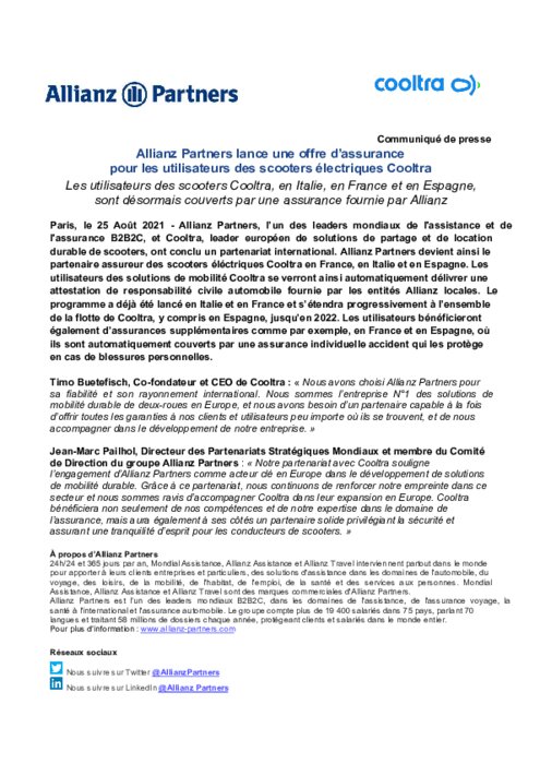 Allianz Partners, l’un des leaders mondiaux de l'assistance et de l'assurance B2B2C, et Cooltra, leader européen de solutions de partage et de location durable de scooters, ont conclu un partenariat international. Allianz Partners devient ainsi le partenaire assureur des scooters éléctriques Cooltra en France, en Italie et en Espagne. Les utilisateurs des solutions de mobilité Cooltra se verront ainsi automatiquement délivrer une attestation de responsabilité civile automobile...