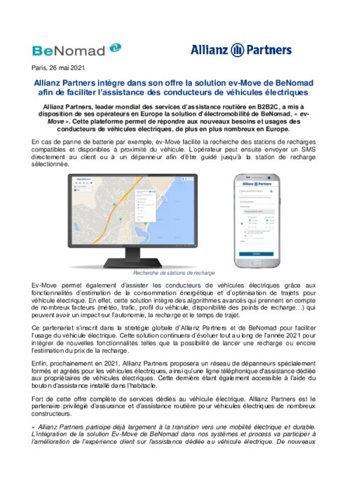 Allianz Partners, leader mondial des services d’assistance routière en B2B2C, a mis à disposition de ses opérateurs en Europe la solution d’électromobilité de BeNomad, « ev-Move ». Cette plateforme permet de répondre aux nouveaux besoins et usages des conducteurs de véhicules électriques, de plus en plus nombreux en Europe.