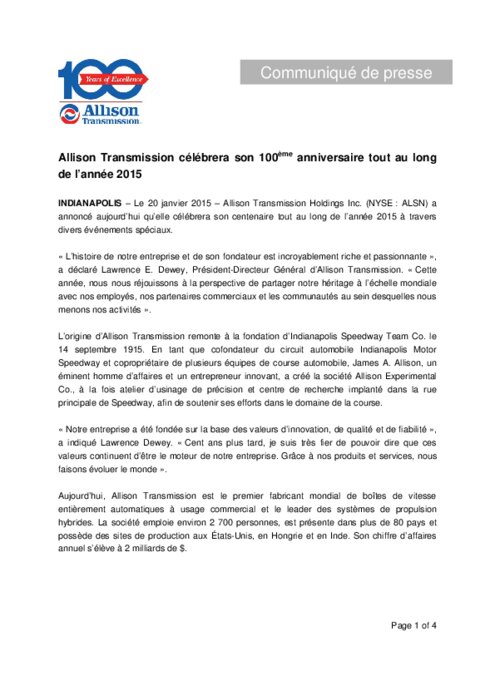 Allison Transmission Holdings Inc. a annoncé aujourd’hui qu’elle célébrera son centenaire tout au long de l’année 2015 à travers divers événements spéciaux.