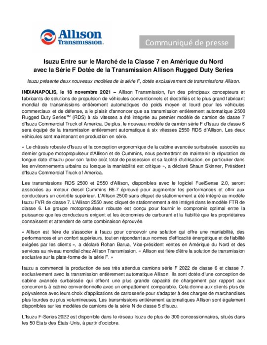 Allison Transmission, l'un des principaux concepteurs et fabricants de solutions de propulsion de véhicules conventionnels et électrifiés et le plus grand fabricant mondial de transmissions entièrement automatiques de poids moyen et lourd pour les véhicules commerciaux et de défense, a le plaisir d'annoncer que sa transmission entièrement automatique 2500 Rugged Duty SeriesTM (RDS) à six vitesses a été intégrée au premier modèle de camion de classe 7 d'Isuzu Commercial Truck of America...