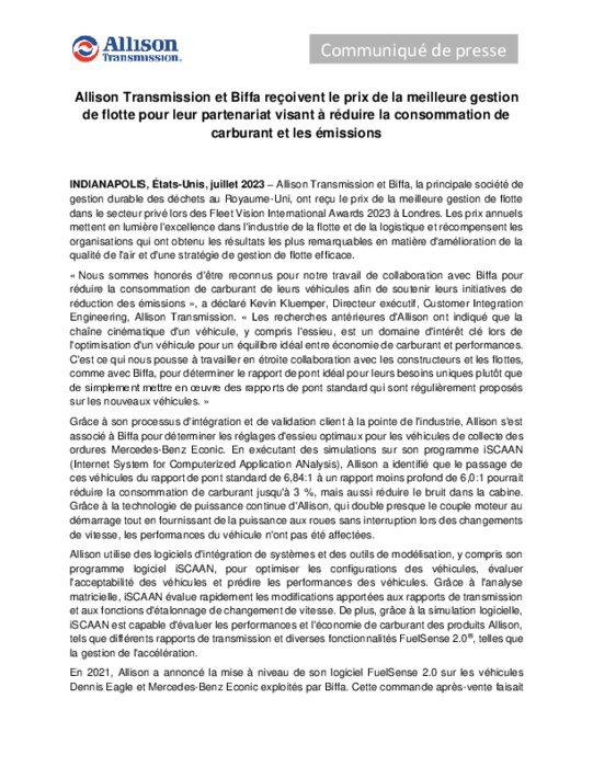 Allison Transmission et Biffa, la principale société de gestion durable des déchets au Royaume-Uni, ont reçu le prix de la meilleure gestion de flotte dans le secteur privé lors des Fleet Vision International Awards 2023 à Londres. Les prix annuels mettent en lumière l'excellence dans l'industrie de la flotte et de la logistique et récompensent les organisations qui ont obtenu les résultats les plus remarquables en matière d'amélioration de la qualité de l'air et d'une stratégie de gestion.
