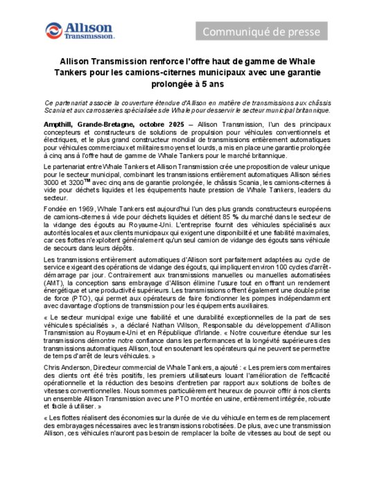 Allison Transmission, l'un des principaux concepteurs et constructeurs de solutions de propulsion pour véhicules conventionnels et électriques, et le plus grand constructeur mondial de transmissions entièrement automatiques pour véhicules commerciaux et militaires moyens et lourds, a mis en place une garantie prolongée à cinq ans à l'offre haut de gamme de Whale Tankers pour le marché britannique.