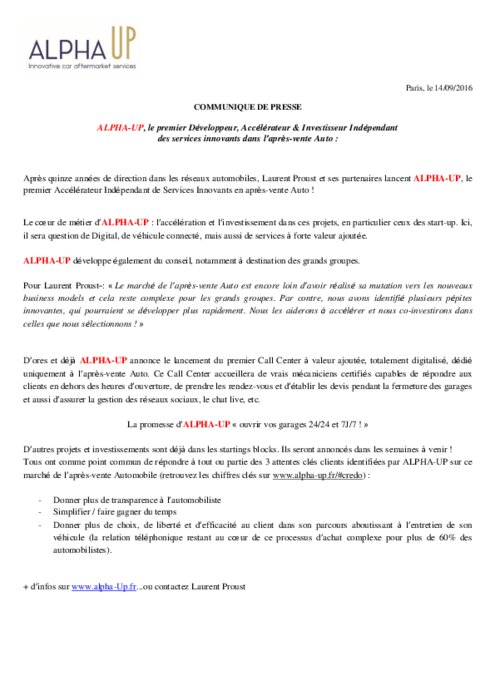Après quinze années de direction dans les réseaux automobiles, Laurent Proust et ses partenaires lancent ALPHA-UP, le premier Accélérateur Indépendant de Services Innovants en après-vente Auto ! Le cœur de métier d’ALPHA-UP : l’accélération et l’investissement dans ces projets, en particulier ceux des start-up. Ici, il sera question de Digital, de véhicule connecté, mais aussi de services à forte valeur ajoutée. ALPHA-UP développe également du conseil, notamment à destination des grands groupes.