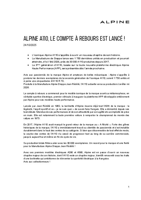 Avis aux passionnés de la marque Alpine et amateurs de belles mécaniques : Alpine s’apprête à produire les derniers exemplaires de la seconde génération de l’iconique A110, soient 1 750 unités et à peine une cinquantaine d’A110 R 70. Produite à la Manufacture Alpine Dieppe Jean Rédélé, l’A110 actuelle verra sa production s’arrêter mi 2026.