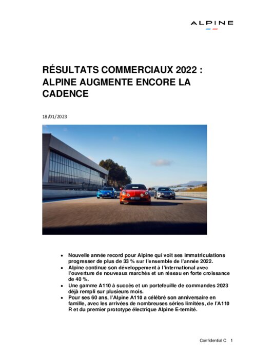 La marque atteint de nouveaux records de vente en 2022 avec 3 546 véhicules immatriculés, soit une croissance de 33 % par rapport à 2021, dans un marché global en décroissance de 4,5 %. Elle confirme une dynamique forte de développement entamée depuis 2021, date de l’annonce du plan Renaulution et de sa restructuration complète. Portée par le lancement de séries limitées à succès, les versions haut de gamme représentent plus des deux tiers des ventes d’Alpine A110.