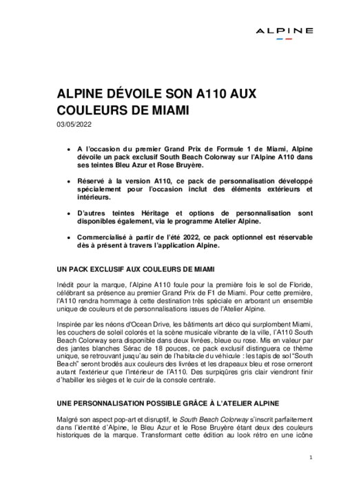 Constructeurs 03 mai 2022 - 09:07 A l’occasion du premier Grand Prix de Formule 1 de Miami, Alpine dévoile un pack exclusif South Beach Colorway sur l’Alpine A110 dans ses teintes Bleu Azur et Rose Bruyère. PDF (142 Ko) Télécharger