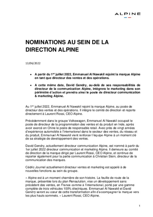 A partir du 1er juillet 2022, Emmanuel Al Nawakil rejoint la marque Alpine en tant que directeur des ventes et des opérations. A cette même date, David Gendry, au-delà de ses responsabilités de directeur de la communication Alpine, intègrera le marketing dans son périmètre d’action et prendra ainsi le poste de directeur communication & marketing Alpine.