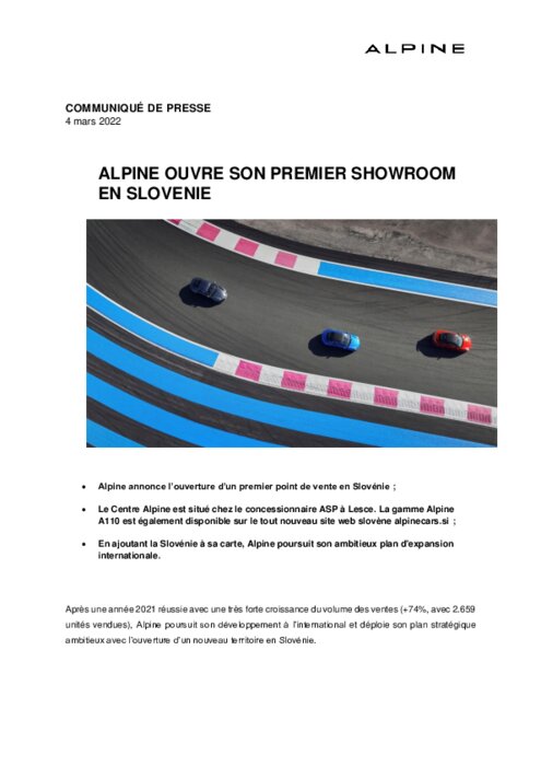 Après une année 2021 réussie avec une très forte croissance du volume des ventes (+74%, avec 2.659 unités vendues), Alpine poursuit son développement à l’international et déploie son plan stratégique ambitieux avec l’ouverture d’un nouveau territoire en Slovénie.