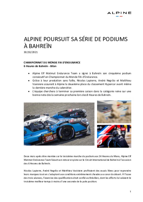 Deux mois après être montée sur la troisième marche du podium aux 24 Heures du Mans, Alpine Elf Matmut Endurance Team faisait son retour en piste sur le Circuit International de Bahreïn à l’occasion des 6 Heures de Bahreïn. Nicolas Lapierre, André Negrão et Matthieu Vaxiviere profitaient des essais libres pour reprendre leurs marques tout en s’adaptant aux conditions extrêmement chaudes au cœur du désert.