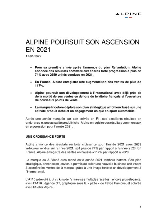 Constructeurs 17 janvier 2022 - 08:51 Après une année marquée par son arrivée en F1, ses excellents résultats en endurance et une actualité produit riche, Alpine enregistre des résultats commerciaux en progression pour l’année 2021. PDF (235 Ko) Télécharger