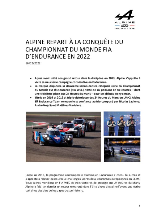 deux sacres mondiaux en FIA WEC et trois victoires de prestige aux 24 Heures du Mans, Alpine a fait l’an dernier un retour remarqué dans l’élite d’une discipline l’ayant vue écrire