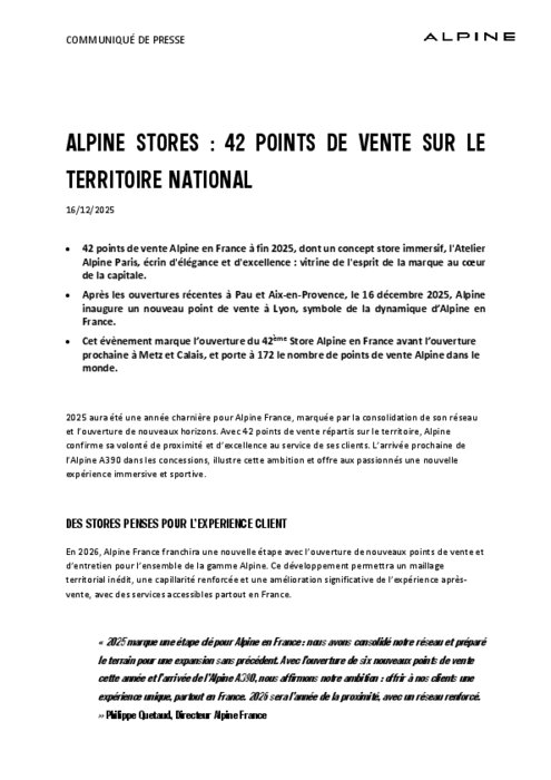 42 points de vente Alpine en France à fin 2025, dont un concept store immersif, l'Atelier Alpine Paris, écrin d'élégance et d'excellence : vitrine de l'esprit de la marque au cœur de la capitale. Après les ouvertures récentes à Pau et Aix-en-Provence, le 16 décembre 2025, Alpine inaugure un nouveau point de vente à Lyon, symbole de la dynamique d'Alpine en France.