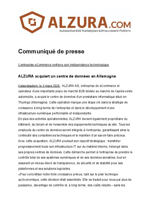 ALZURA, entreprise de eCommerce et opérateur d’une importante place de marché B2B dédiée au marché de l’après-vente automobile, a acquis le centre de données d’un prestataire informatique situé en Thuringe (Allemagne). Cette opération marque une étape clé dans la stratégie de croissance à long terme de l’entreprise et dans le développement d’une infrastructure numérique performante et indépendante.