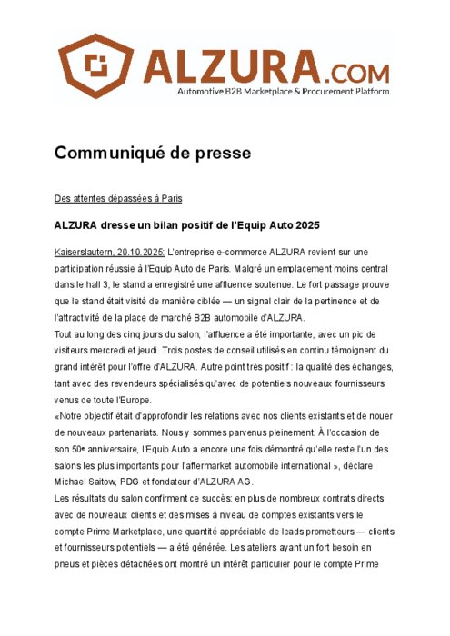 ALZURA dresse un bilan très positif de sa participation à l’Equip Auto 2025 à Paris malgré un emplacement en hall 3, le stand a attiré une forte fréquentation et de nombreux échanges qualifiés avec revendeurs et fournisseurs venus de toute l’Europe. Plusieurs contrats directs, de nombreux leads prometteurs et de nombreuses mises à niveau vers le compte Prime Marketplace — notamment de la part d’ateliers très demandeurs de pneus et pièces — confirment la pertinence et l’attractivité de la place de marché B2B d’ALZURA.