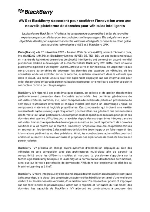 "BlackBerry IVY pourra faire fonctionner de multiples systèmes d'exploitation de véhicules et types de cloud afin d'être compatible quels que soient le modèle et la marque", assure Amazon.