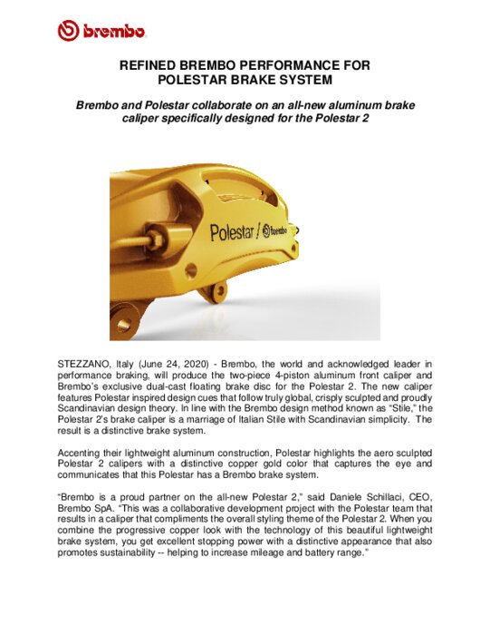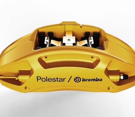 Brembo fournira pour le Polestar 2 l'étrier avant en aluminium à 4 pistons en deux parties et un disque de frein flottant exclusif « Dual cast » en deux matériaux : fonte et aluminium. Le nouvel étrier se caractérise par un design inspiré du Polestar à faible résistance : une excellente puissance de freinage avec un look distinctif qui favorise également la durabilité - aidant à augmenter le kilométrage et la durée de vie des batteries.