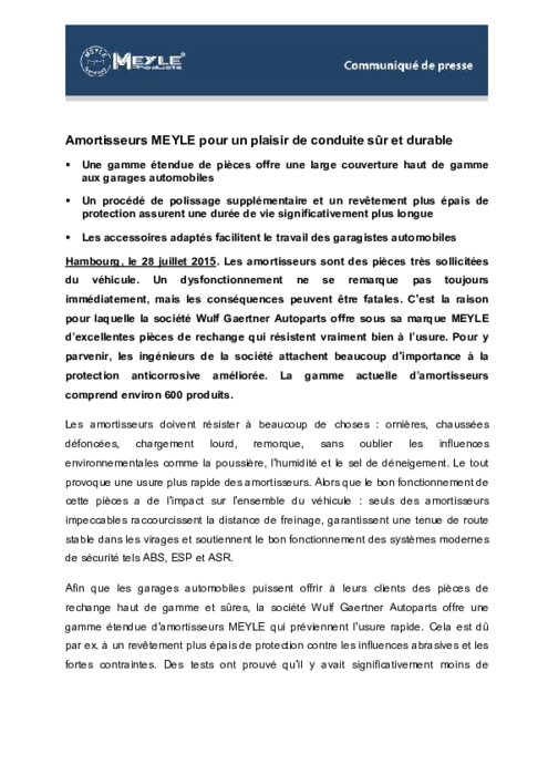 Les amortisseurs sont des pièces très sollicitées du véhicule. Un dysfonctionnement ne se remarque pas toujours immédiatement, mais les conséquences peuvent être fatales. C'est la raison pour laquelle la société Wulf Gaertner Autoparts offre sous sa marque MEYLE d’excellentes pièces de rechange qui résistent vraiment bien à l’usure. Pour y parvenir, les ingénieurs de la société attachent beaucoup d'importance à la protection anticorrosive améliorée.
