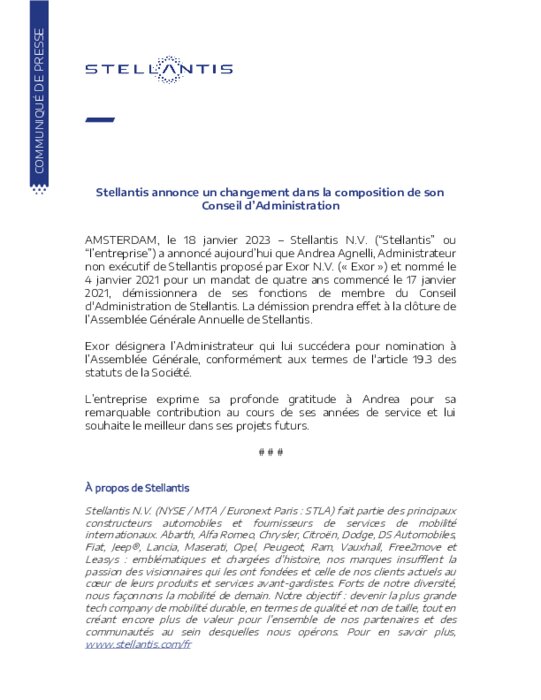 Stellantis a annoncé aujourd’hui que Andrea Agnelli, Administrateur non exécutif de Stellantis proposé par Exor N.V. (« Exor ») et nommé le 4 janvier 2021 pour un mandat de quatre ans commencé le 17 janvier 2021, démissionnera de ses fonctions de membre du Conseil d'Administration de Stellantis. La démission prendra effet à la clôture de l’Assemblée Générale Annuelle de Stellantis.