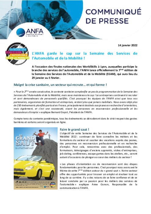 A l’occasion des finales nationales des WorldSkills à Lyon, auxquelles participe la branche des services de l’automobile, l’ANFA lance officiellement la 7ème édition de la Semaine des Services de l’Automobile et de la Mobilité (SSAM), qui aura lieu du 29 janvier au 5 février. Malgré la crise sanitaire, les entreprises continuent à recruter et sont demandeuses de personnels qualifiés...