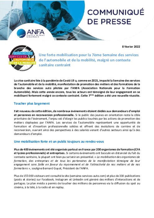 La crise sanitaire liée à la pandémie de Covid-19 a, comme en 2021, impacté la Semaine des services de l’automobile et de la mobilité, manifestation de promotion des métiers et des formations de la branche des services auto pilotée par l’ANFA (Association Nationale pour la Formation Automobile). Mais cette année encore, tous les acteurs ont témoigné de leur engagement en se mobilisant fortement malgré ce contexte contraint. Cette 7ème édition a été une nouvelle réussite.