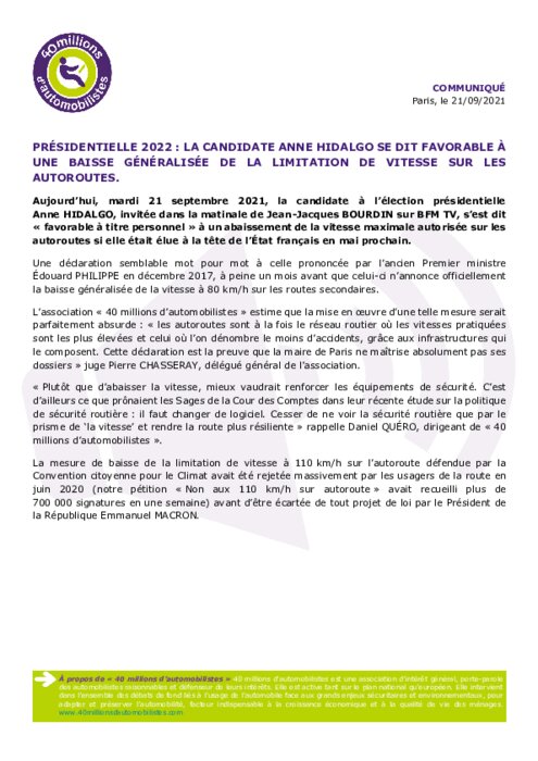 Aujourd’hui, mardi 21 septembre 2021, la candidate à l’élection présidentielle Anne HIDALGO, invitée dans la matinale de Jean-Jacques BOURDIN sur BFM TV, s’est dit « favorable à titre personnel » à un abaissement de la vitesse maximale autorisée sur les autoroutes si elle était élue à la tête de l’État français en mai prochain.