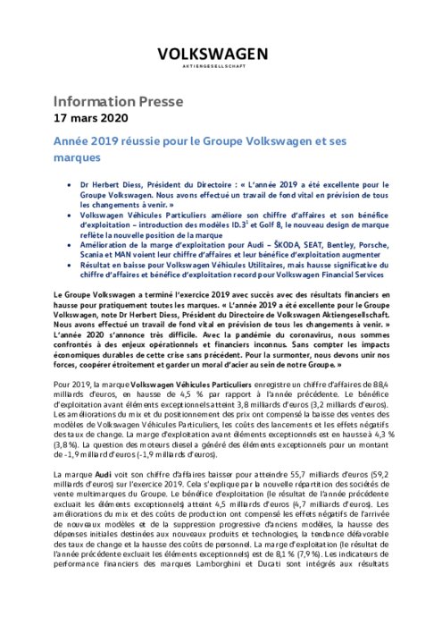 Le Groupe Volkswagen a terminé l'exercice 2019 avec succès avec des résultats financiers en hausse pour pratiquement toutes les marques. " L'année 2019 a été excellente pour le Groupe Volkswagen, note Dr Herbert Diess, Président du Directoire de Volkswagen Aktiengesellschaft. Nous avons effectué un travail de fond vital en prévision de tous les changements à venir. " L'année 2020 s'annonce très difficile. Avec la pandémie du coronavirus, nous sommes confrontés à des enjeux opérationnels ..."