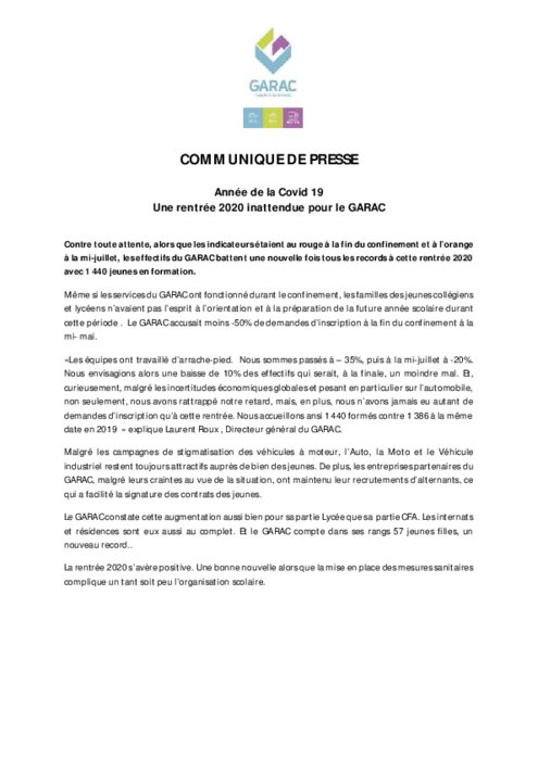 Services 08 septembre 2020 - 11:30 Contre toute attente, alors que les indicateurs étaient au rouge à la fin du confinement et à l’orange à la mi-juillet, les effectifs du GARAC battent une nouvelle fois tous les records à cette rentrée 2020 avec 1 440 jeunes en formation. PDF (6 Ko) Télécharger