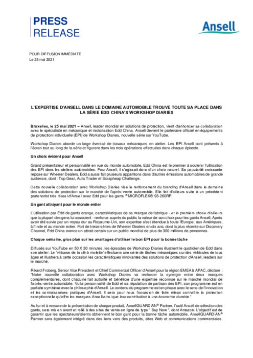 Ansell, leader mondial en solutions de protection, vient d'annoncer sa collaboration avec le spécialiste en mécanique et motorisation Edd China. Ansell devient le partenaire officiel en équipements de protection individuelle (EPI) de Workshop Diaries, nouvelle série sur YouTube. Workshop Diaries aborde un large éventail de travaux mécaniques en atelier. Les EPI Ansell sont présents à l'écran tout au long de la série...