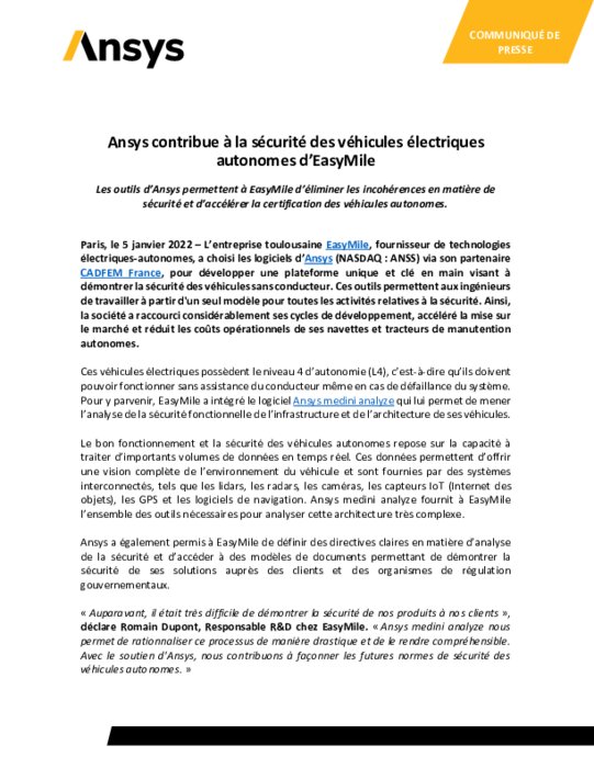 L’entreprise toulousaine EasyMile, fournisseur de technologies électriques-autonomes, a choisi les logiciels d’Ansys (NASDAQ : ANSS) via son partenaire CADFEM France, pour développer une plateforme unique et clé en main visant à démontrer la sécurité des véhicules sans conducteur. Ces outils permettent aux ingénieurs de travailler à partir d'un seul modèle pour toutes les activités relatives à la sécurité. Ainsi, la société a raccourci considérablement ses cycles de développement...