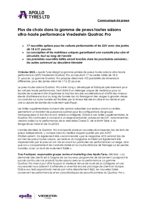 Apollo Tyres élargit sa gamme primée de pneus toutes saisons ultra-haute performance (UHP) Vredestein Quatrac Pro, en ajoutant 17 nouvelles tailles de 18 à 21 pouces. La gamme Quatrac Pro propose désormais 103 possibilités de dimensions différentes, pour des jantes allant de 17 à 22 pouces.