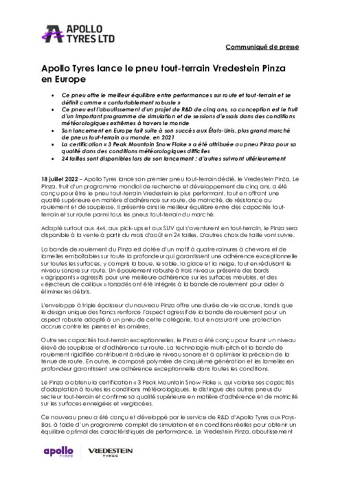 Apollo Tyres lance son premier pneu tout-terrain dédié, le Vredestein Pinza. Le Pinza, fruit d'un programme mondial de recherche et développement de cinq ans, a été conçu pour être le pneu tout-terrain Vredestein le plus performant, tout en offrant une qualité supérieure en matière d'adhérence sur route, de motricité, de résistance au roulement et de souplesse. Il présente ainsi le meilleur équilibre entre des capacités tout-terrain et sur route parmi tous les pneus tout-terrain du marché.