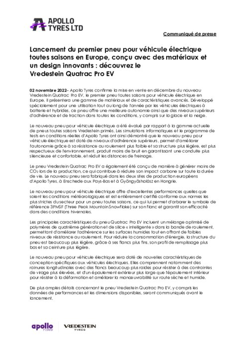 Apollo Tyres confirme la mise en vente en décembre du nouveau Vredestein Quatrac Pro EV, le premier pneu toutes saisons pour véhicule électrique en Europe. Il présentera une gamme de matériaux et de caractéristiques avancés. Développé spécialement pour une utilisation tout au long de l'année par les véhicules électriques à batterie et hybrides, ce pneu offre une meilleure autonomie ainsi que des niveaux supérieurs d'adhérence et de traction dans toutes les conditions.