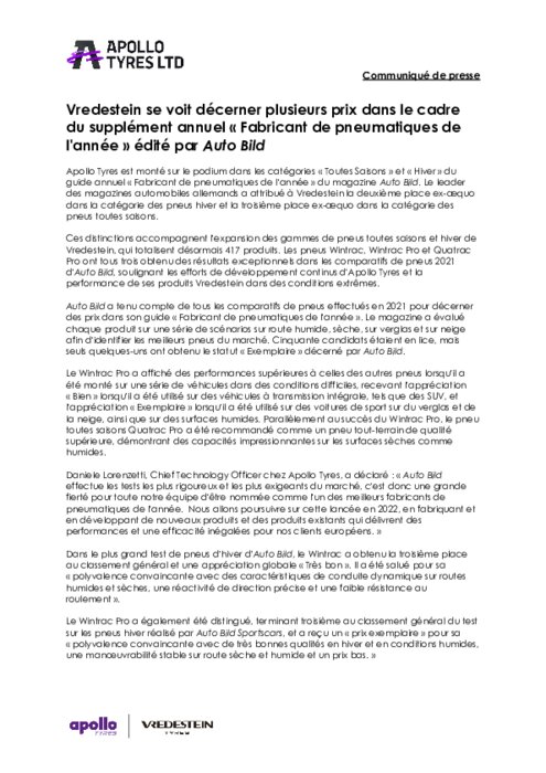 Apollo Tyres est monté sur le podium dans les catégories « Toutes Saisons » et « Hiver » du guide annuel « Fabricant de pneumatiques de l'année » du magazine Auto Bild. Le leader des magazines automobiles allemands a attribué à Vredestein la deuxième place ex-æquo dans la catégorie des pneus hiver et la troisième place ex-æquo dans la catégorie des pneus toutes saisons.