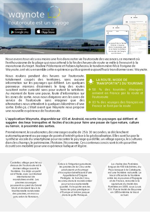 Services 13 juillet 2016 - 17:15 L’application Waynote, disponible sur iOS et Android, raconte les paysages qui défilent et suggère des lieux tranquilles et faciles d’accès pour faire une pause de type nature, culture ou terroir, à proximité des sorties. PDF (6 Mo) Télécharger
