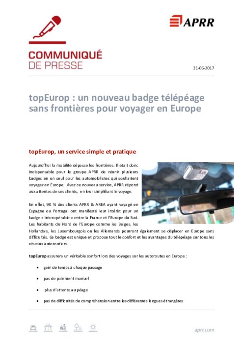 Le groupe APRR propose un nouveau service appelé topEurop. Véritable innovation, ce badge permet de voyager en toute simplicité sur les réseaux autoroutiers de 3 pays européens : la France, l'Espagne, le Portugal dès juillet. C'est une grande première pour APRR qui propose, par ce service, de faciliter la mobilité des conducteurs européens.