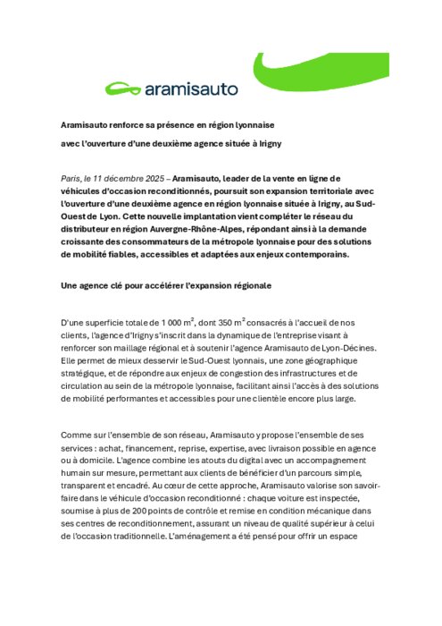 Aramisauto, leader de la vente en ligne de véhicules d’occasion reconditionnés, poursuit son expansion territoriale avec l’ouverture d’une deuxième agence en région lyonnaise située à Irigny, au Sud-Ouest de Lyon. Cette nouvelle implantation vient compléter le réseau du distributeur en région Auvergne-Rhône-Alpes, répondant ainsi à la demande croissante des consommateurs de la métropole lyonnaise pour des solutions de mobilité fiables, accessibles et adaptées aux enjeux contemporains.