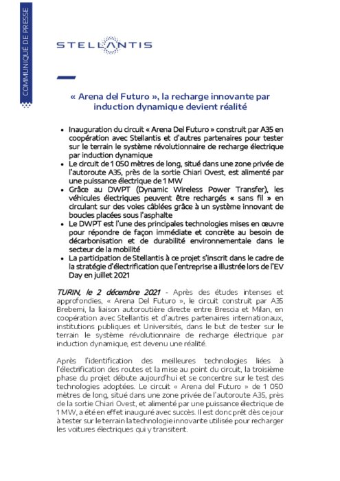 Après des études intenses et approfondies, « Arena Del Futuro », le circuit construit par A35 Brebemi, la liaison autoroutière directe entre Brescia et Milan, en coopération avec Stellantis et d’autres partenaires internationaux, institutions publiques et Universités, dans le but de tester sur le terrain le système révolutionnaire de recharge électrique par induction dynamique, est devenu une réalité.